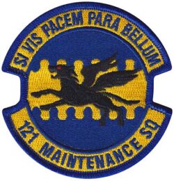 The 121st Maintenance Squadron assigned to 121st Maintenance Group, 21st Air Refueling Wing stationed at Rickenbacker ANGB, OH, is responsible for intermediate-level maintenance on KC-135 aircraft, manages and maintains a munitions stockpile and provides avionics support, performs periodic inspections and structural repair and engine maintenance.